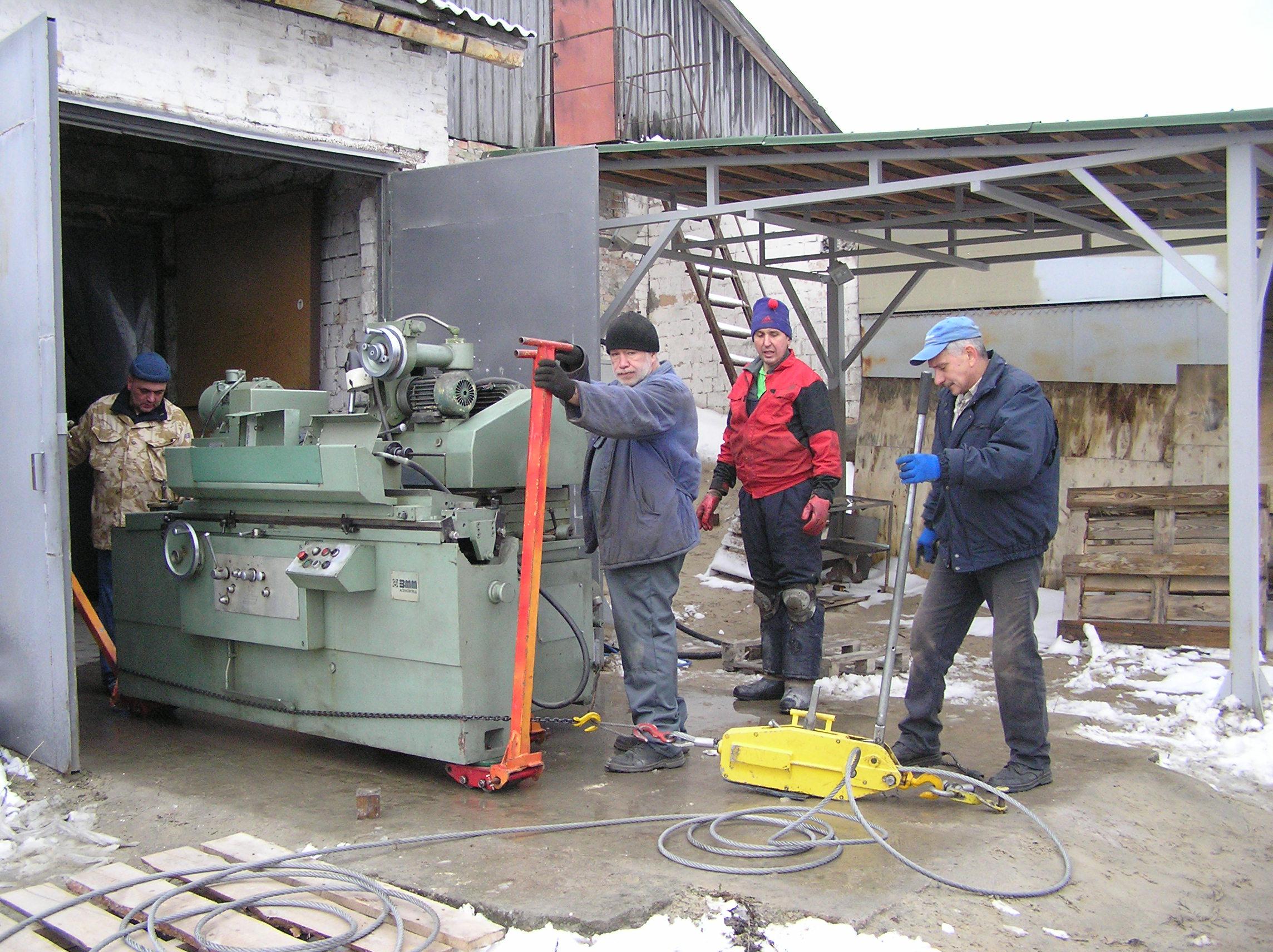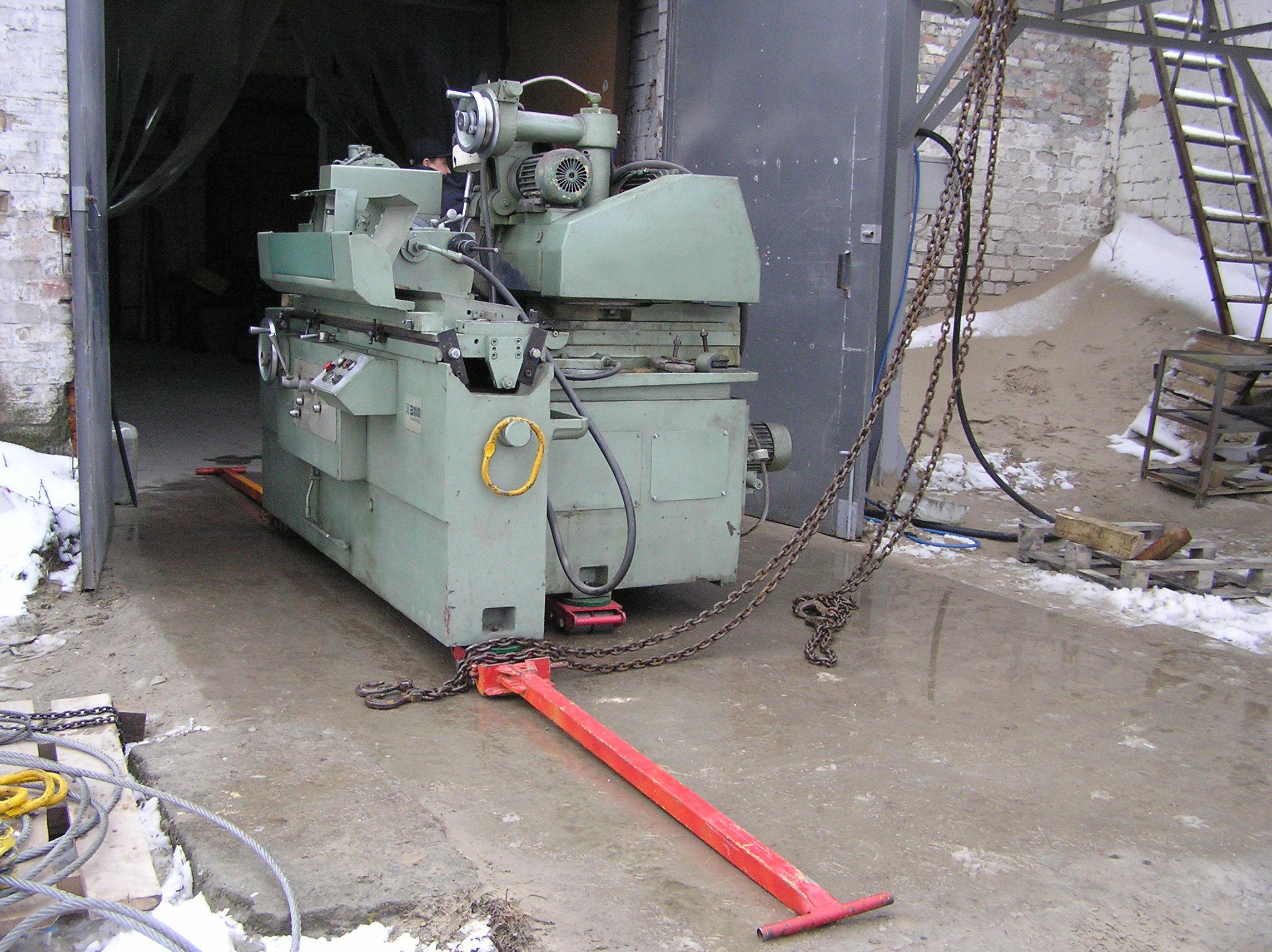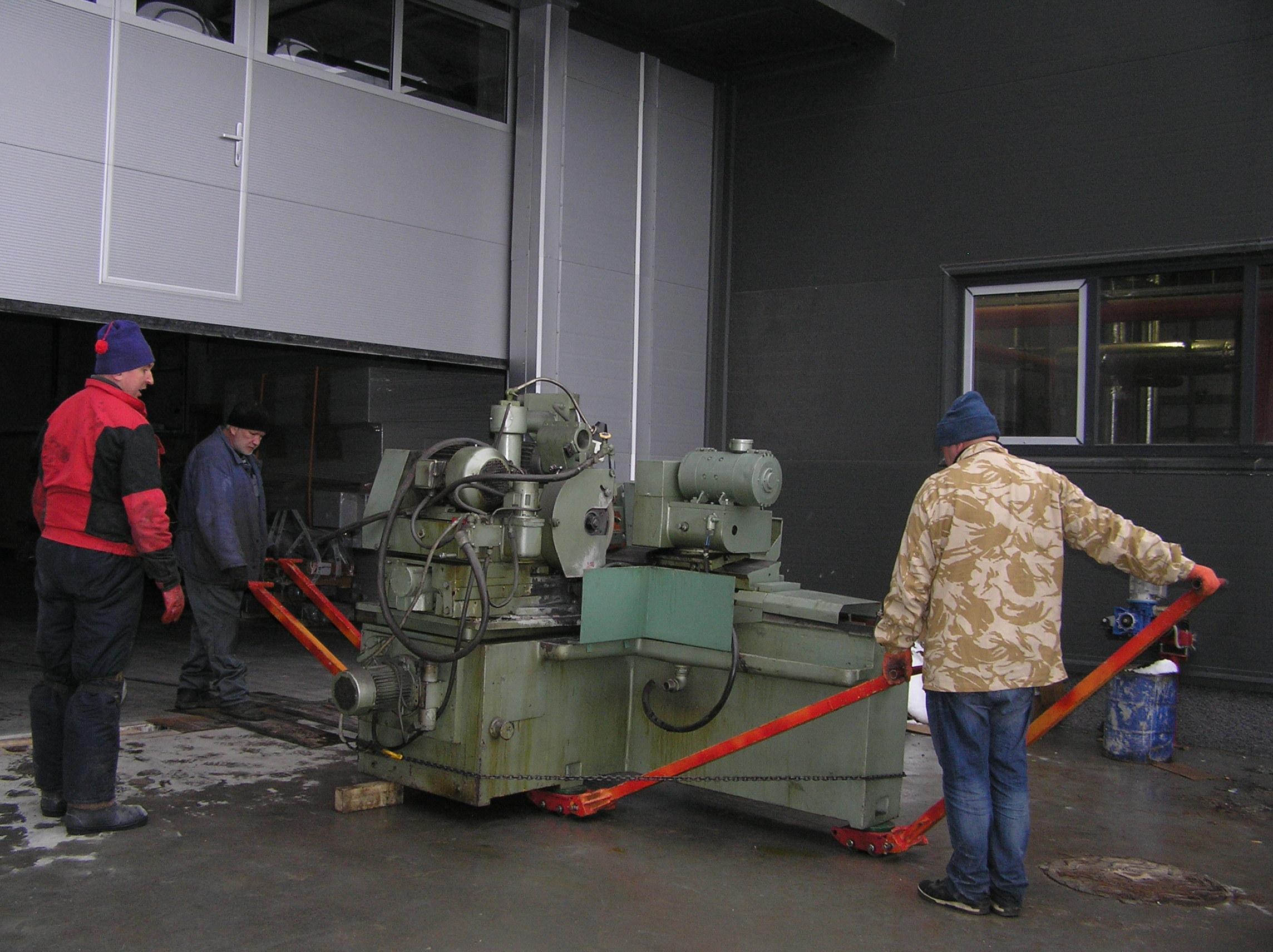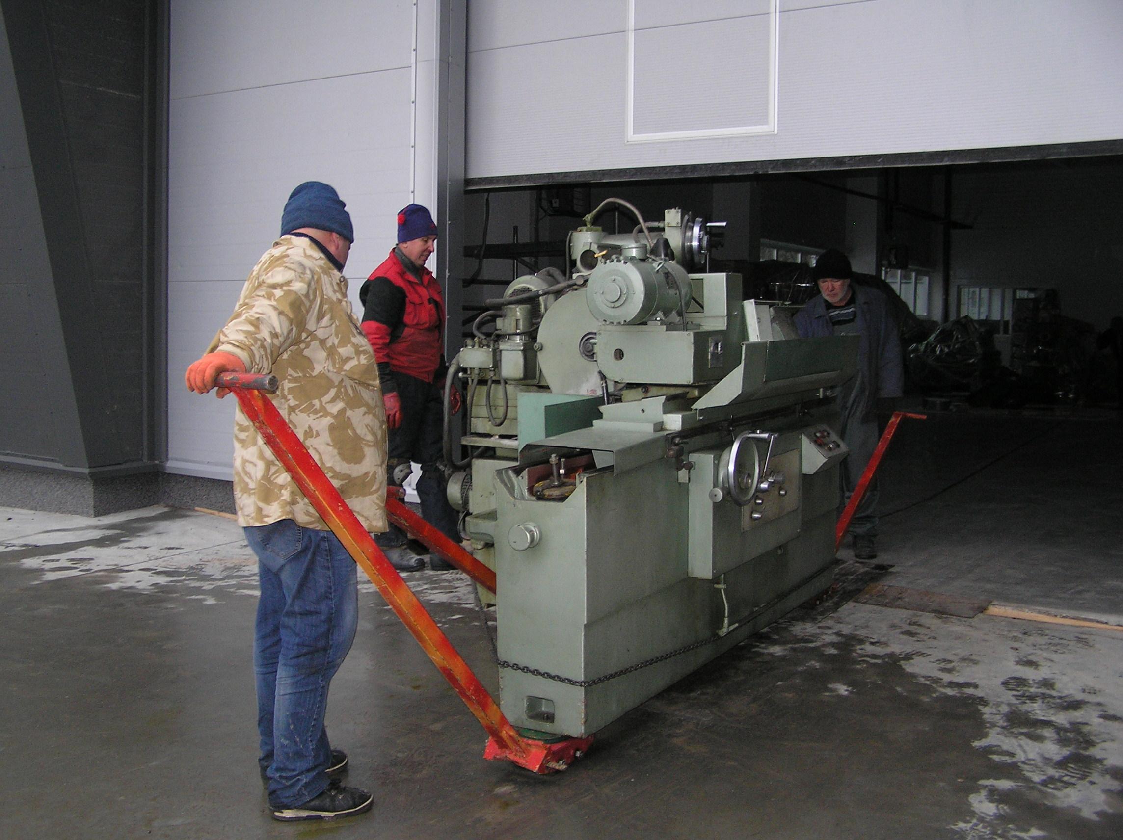 Шлифовальный станок весом около 4 тонн предстояло перевезти из одного производственного помещения в другое. Первым делом станок нужно было выкатить на улицу, чтобы его смог взять манипулятор. Станок домкратами был поднят и установлен на транспортные тележки. Затем он был обвязан и закреплен к лебедке. В несколько заходов, маневрируя по территории цеха, шлифовальный станок был перемещен наружу, в зону действия крана- манипулятора.