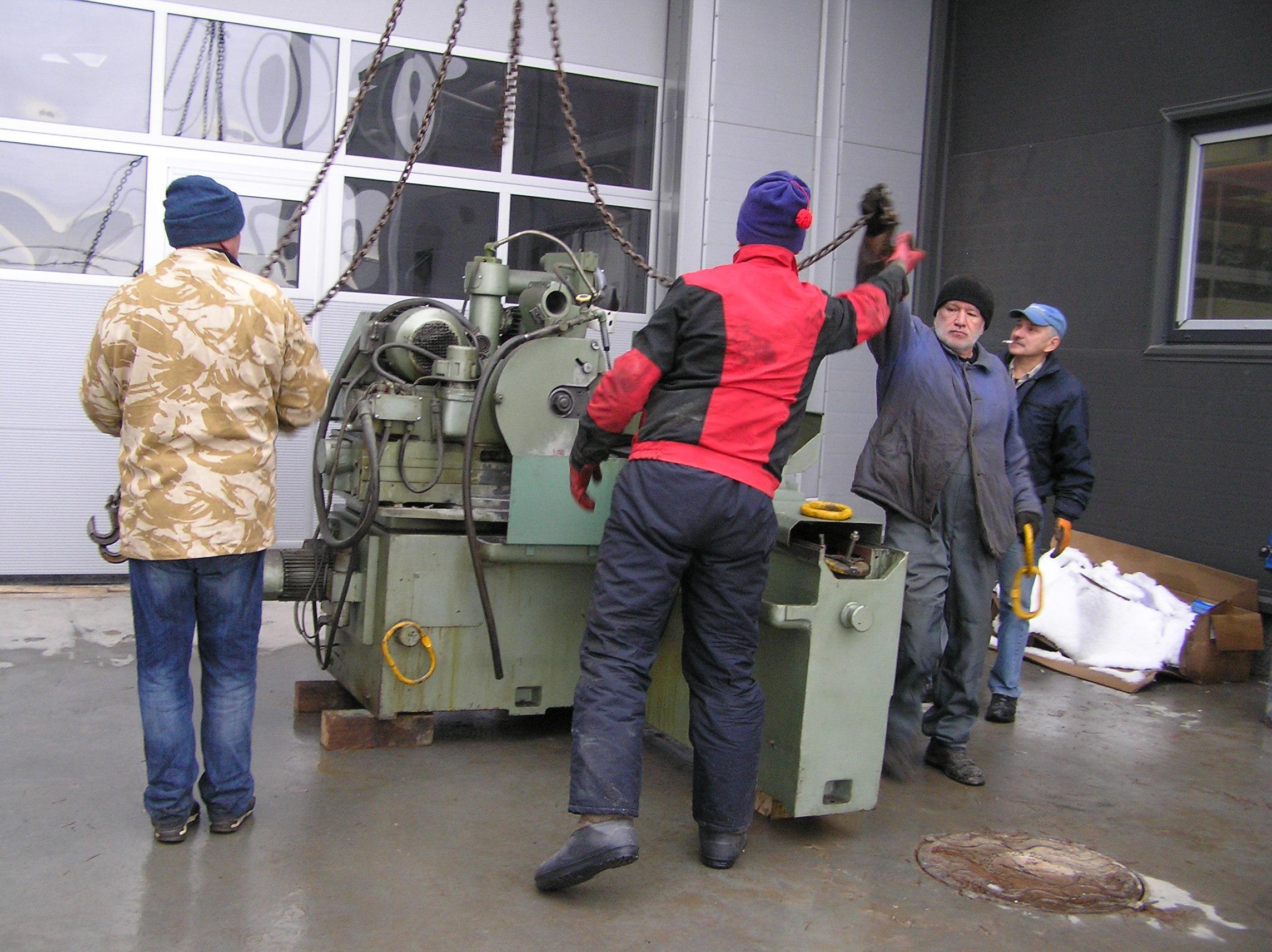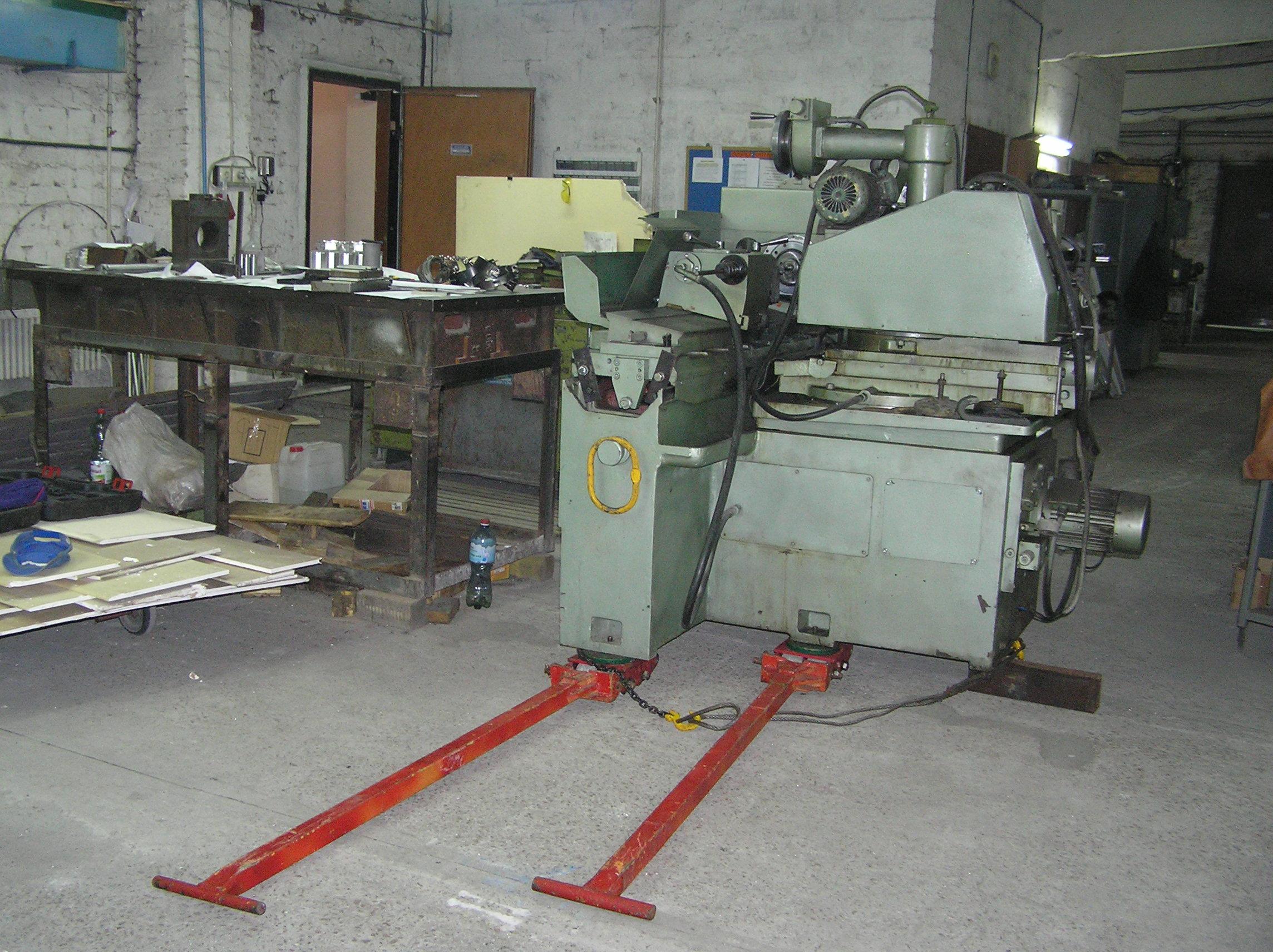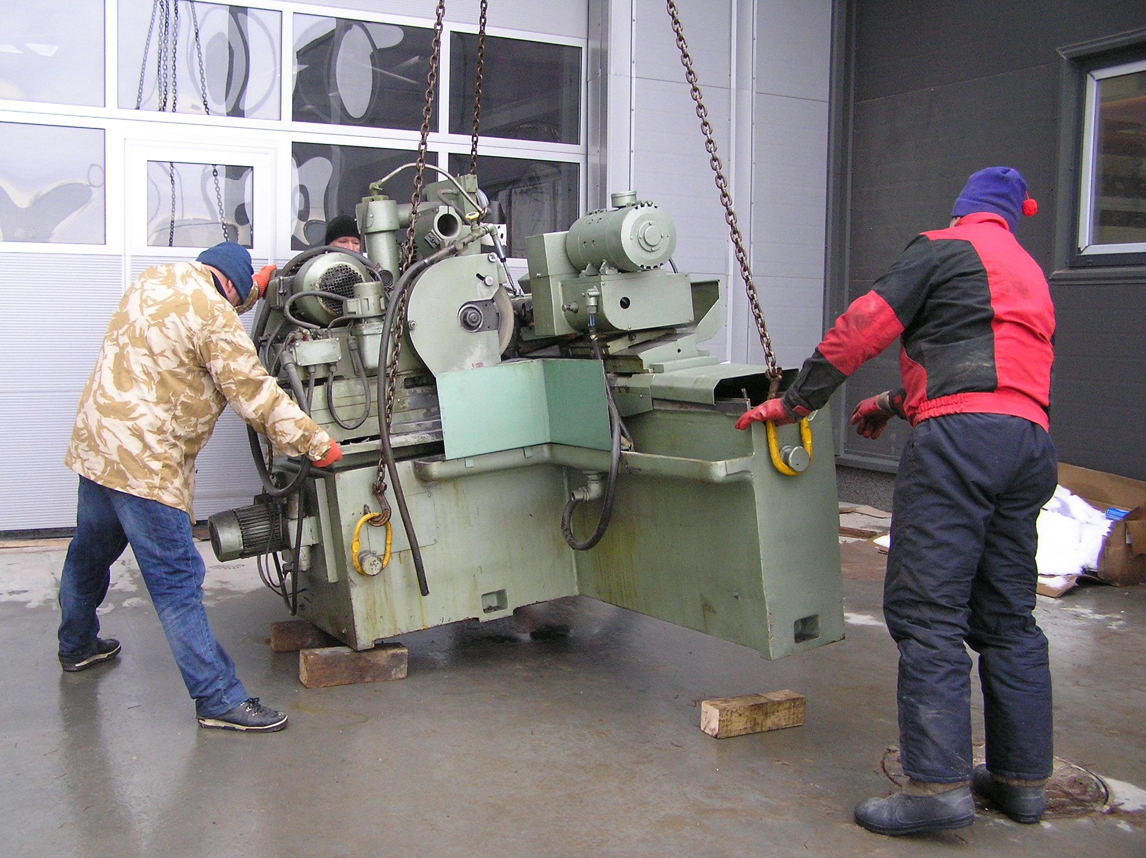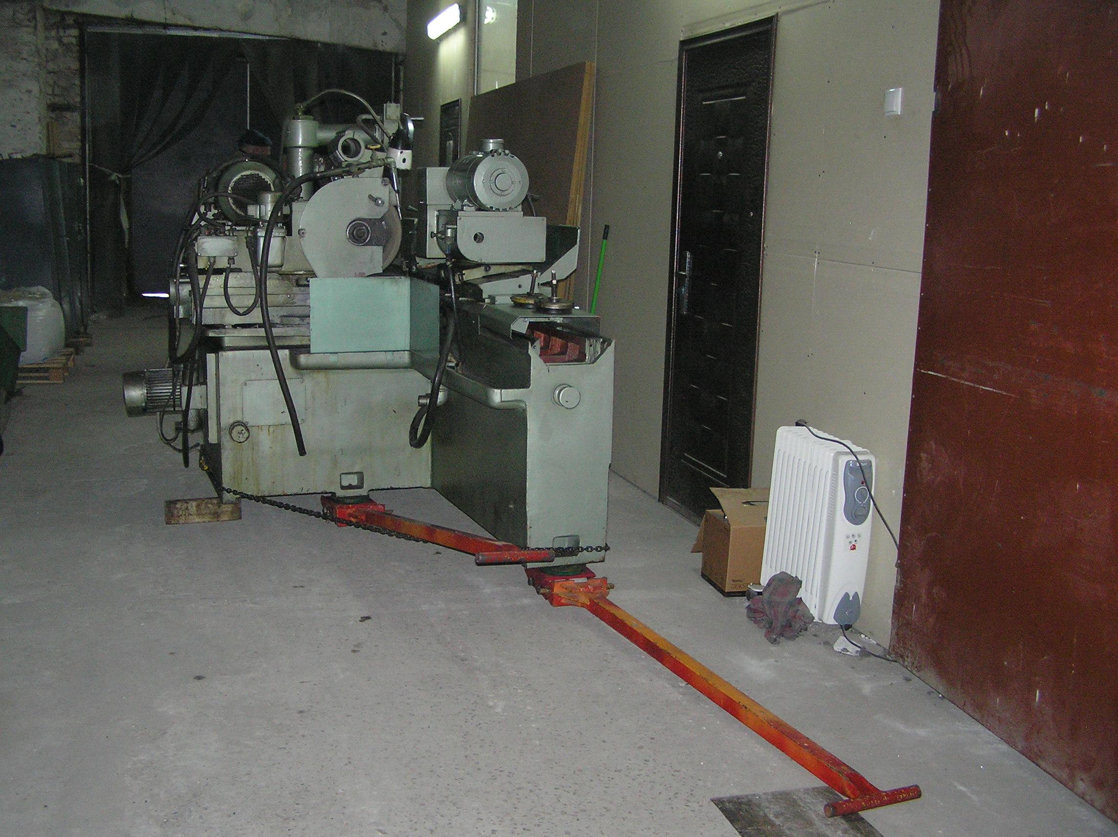 Шлифовальный станок весом около 4 тонн предстояло перевезти из одного производственного помещения в другое. Первым делом станок нужно было выкатить на улицу, чтобы его смог взять манипулятор. Станок домкратами был поднят и установлен на транспортные тележки. Затем он был обвязан и закреплен к лебедке. В несколько заходов, маневрируя по территории цеха, шлифовальный станок был перемещен наружу, в зону действия крана- манипулятора.