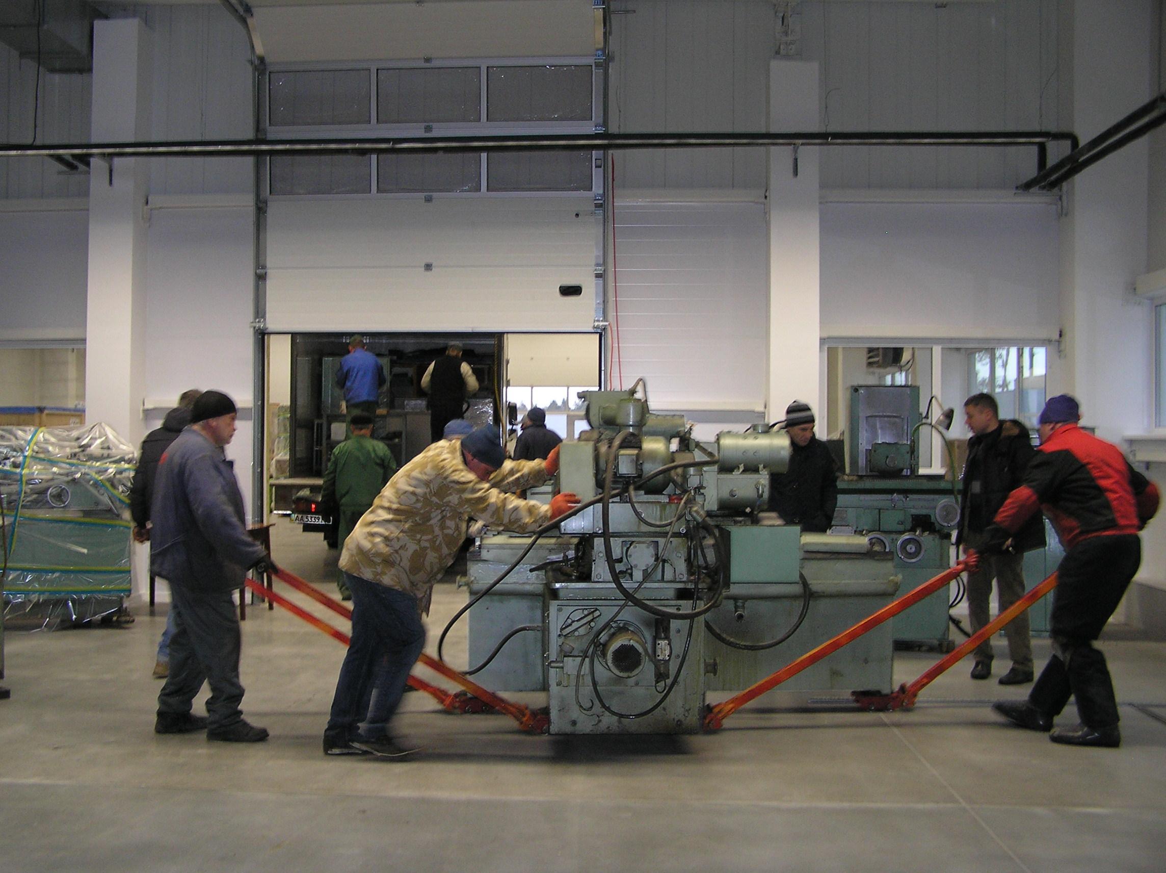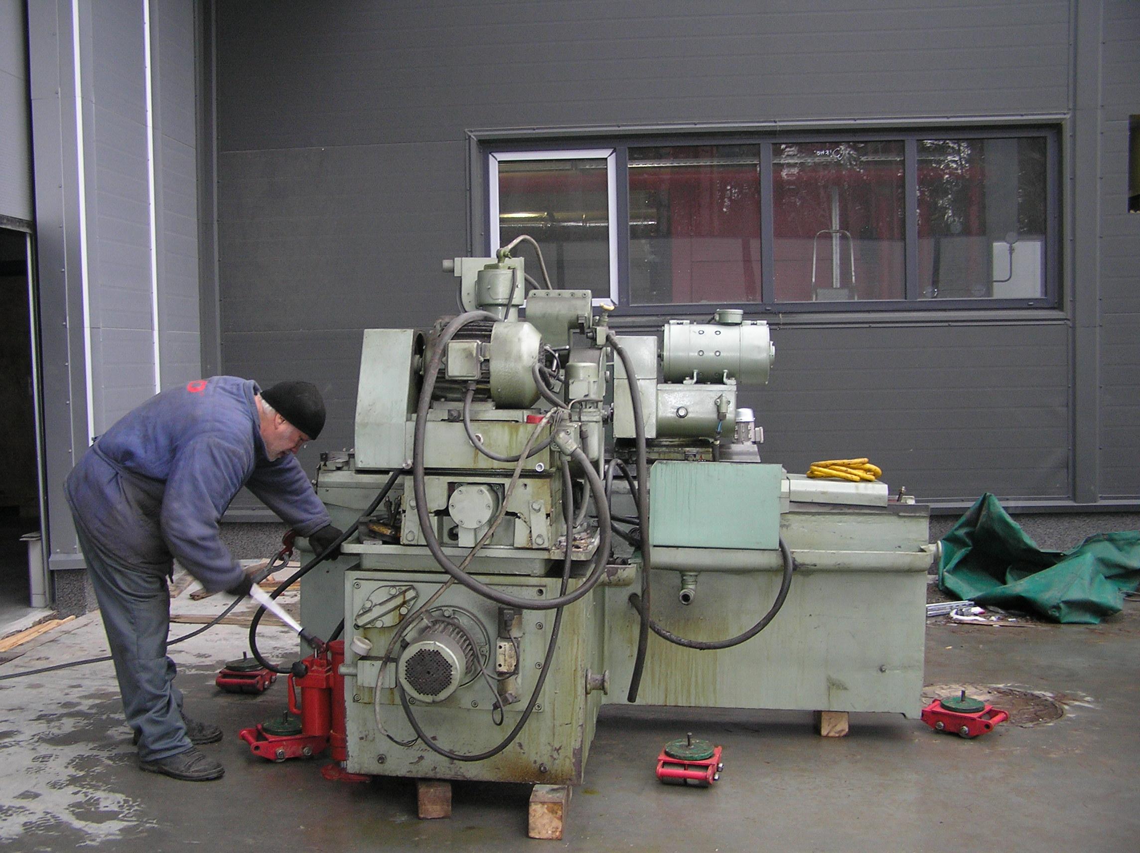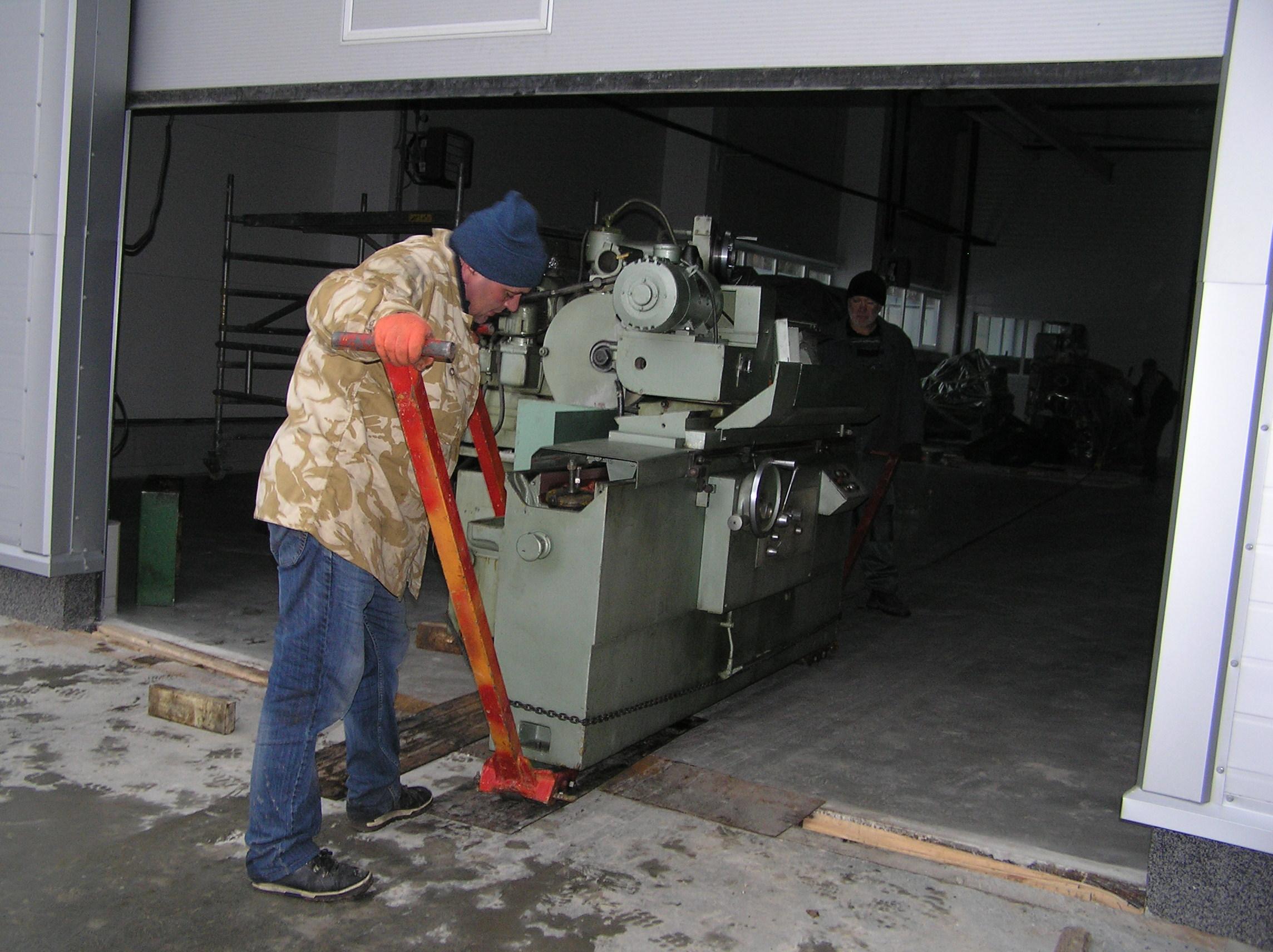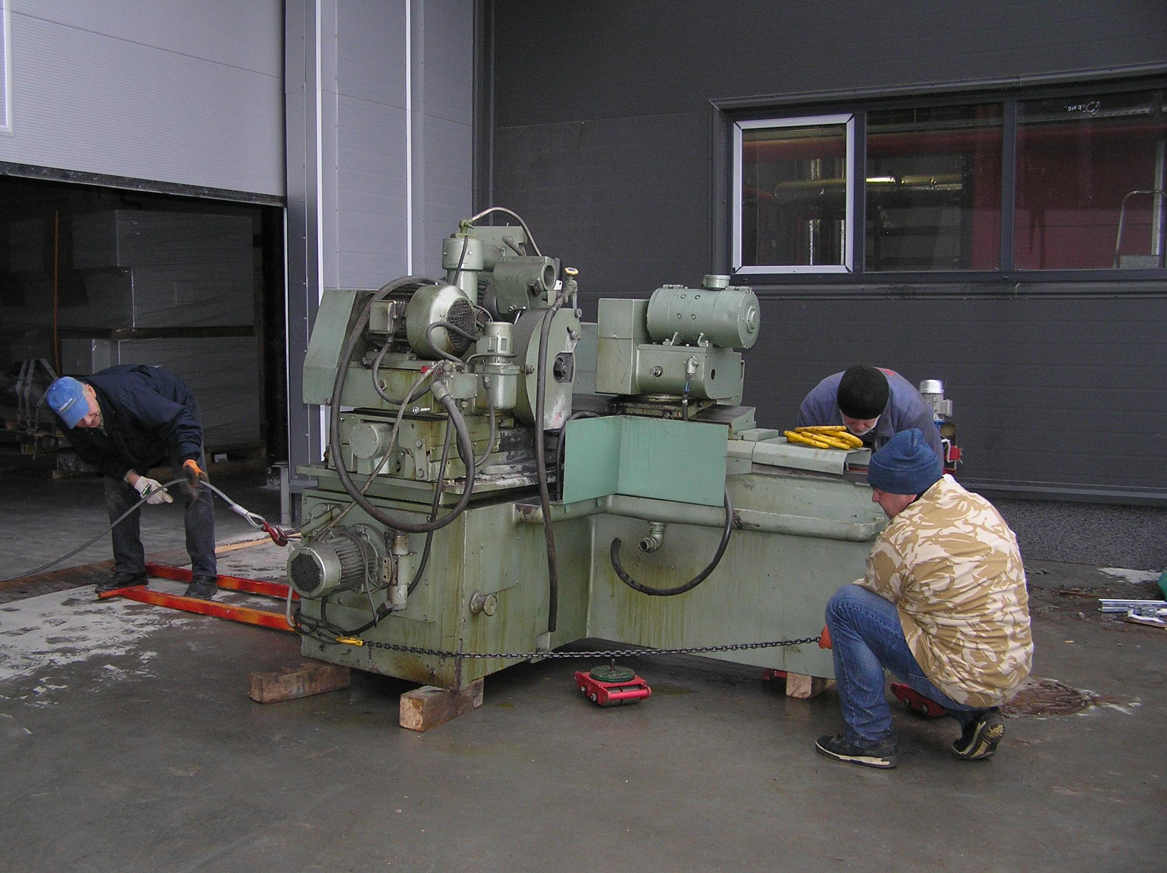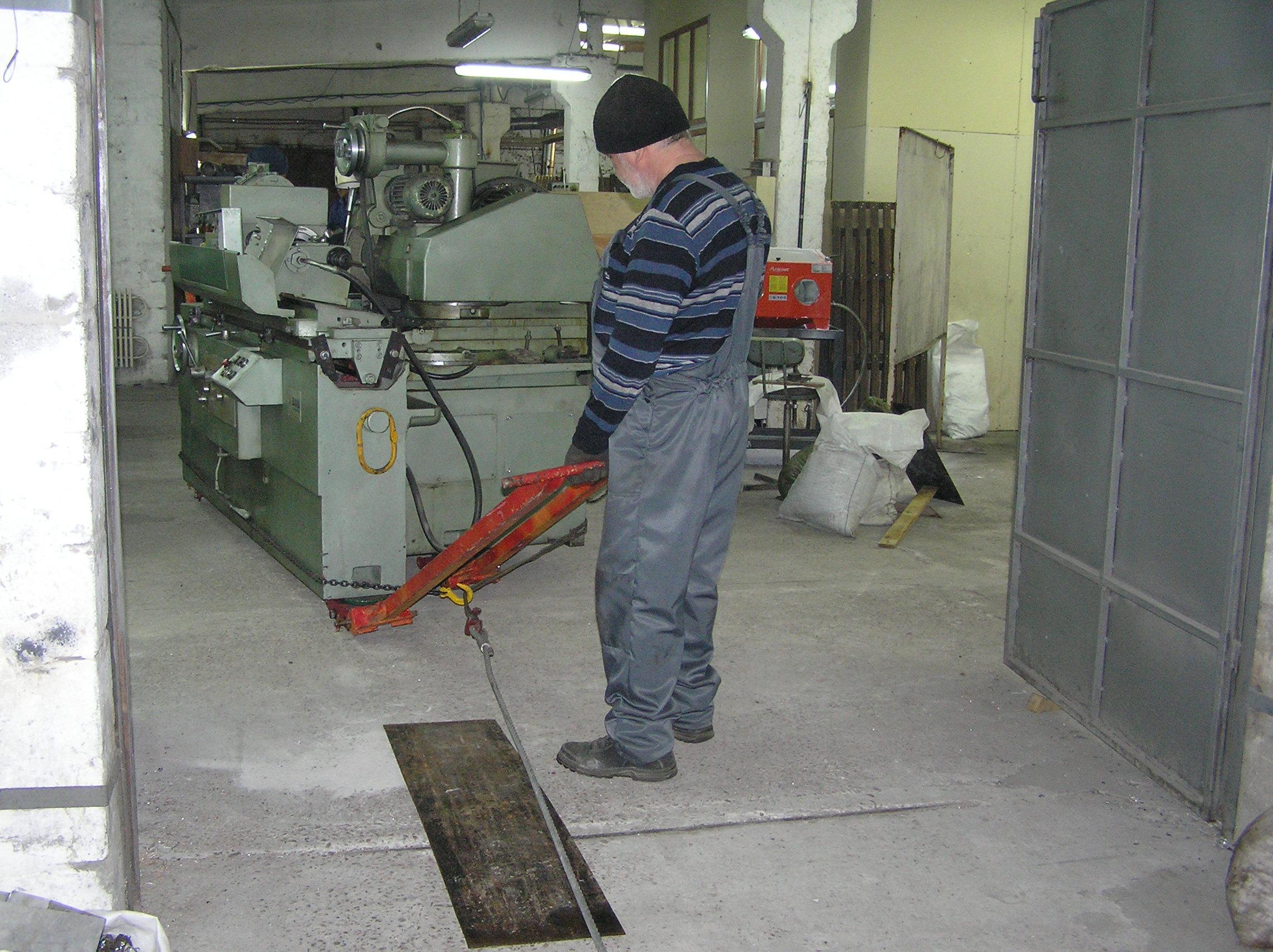 Шлифовальный станок весом около 4 тонн предстояло перевезти из одного производственного помещения в другое. Первым делом станок нужно было выкатить на улицу, чтобы его смог взять манипулятор. Станок домкратами был поднят и установлен на транспортные тележки. Затем он был обвязан и закреплен к лебедке. В несколько заходов, маневрируя по территории цеха, шлифовальный станок был перемещен наружу, в зону действия крана- манипулятора.