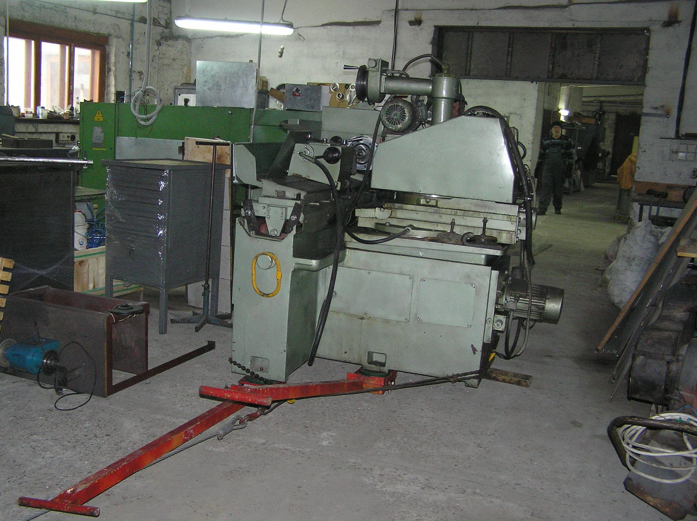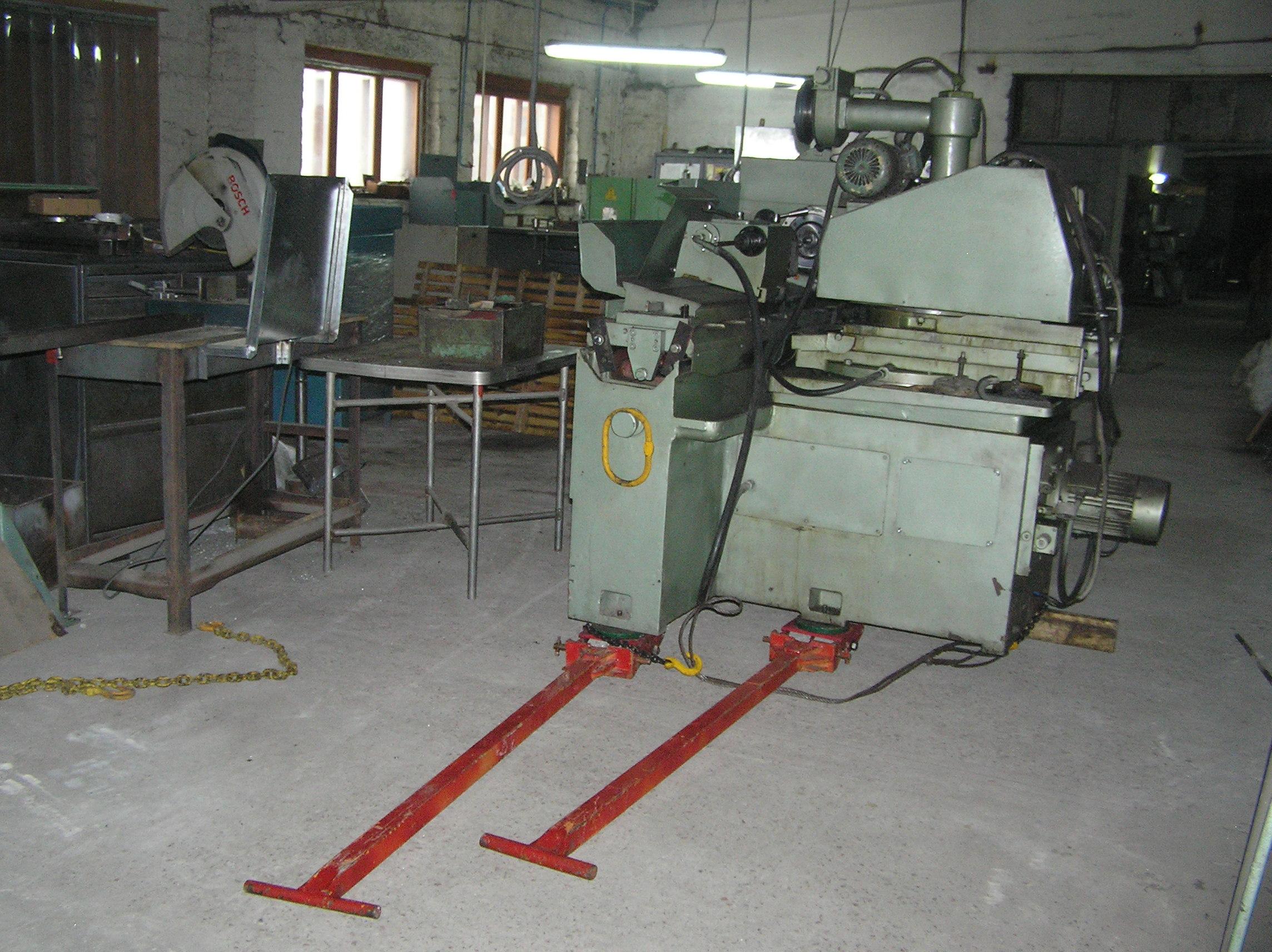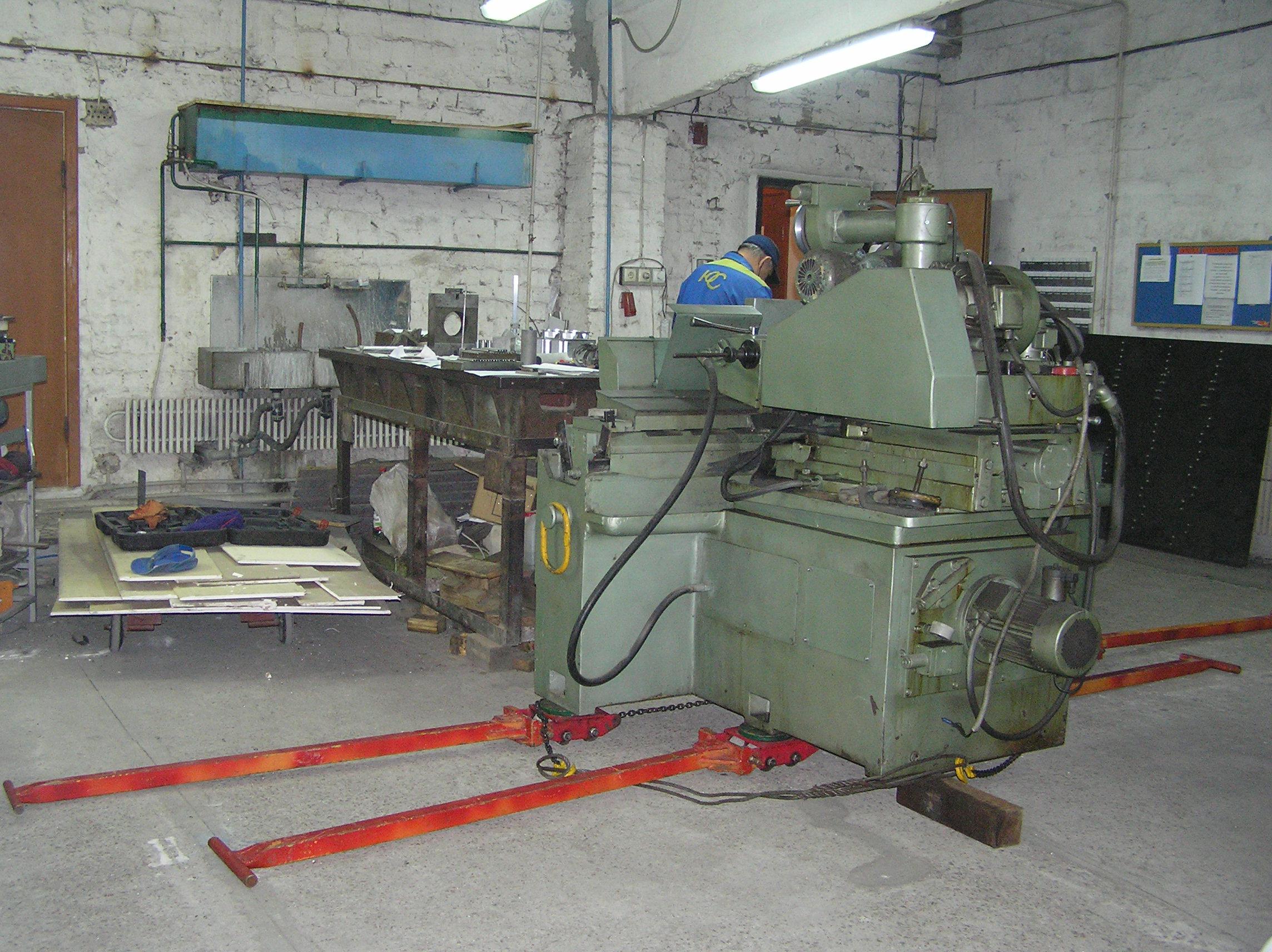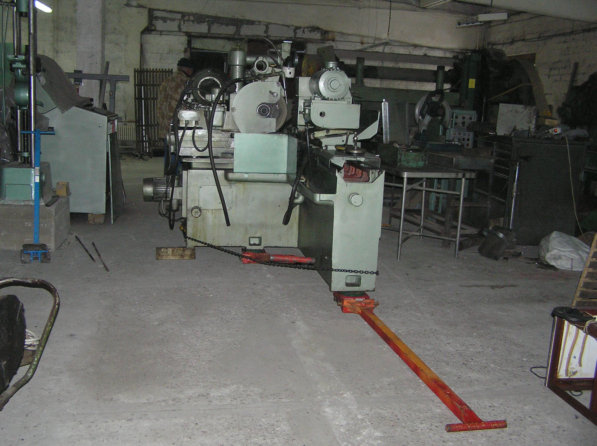 Шлифовальный станок весом около 4 тонн предстояло перевезти из одного производственного помещения в другое. Первым делом станок нужно было выкатить на улицу, чтобы его смог взять манипулятор. Станок домкратами был поднят и установлен на транспортные тележки. Затем он был обвязан и закреплен к лебедке. В несколько заходов, маневрируя по территории цеха, шлифовальный станок был перемещен наружу, в зону действия крана- манипулятора.