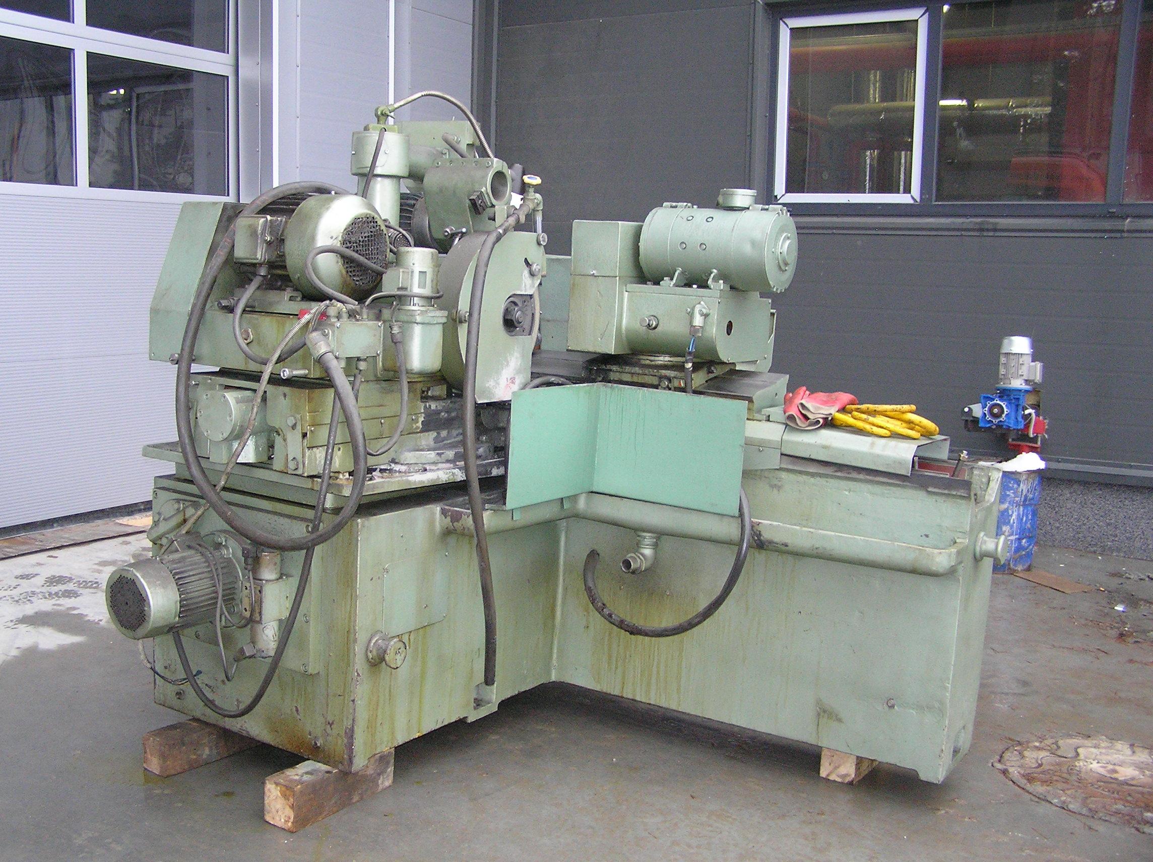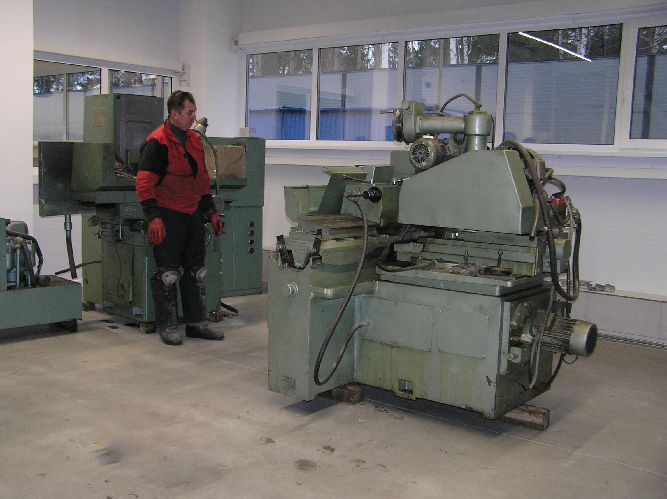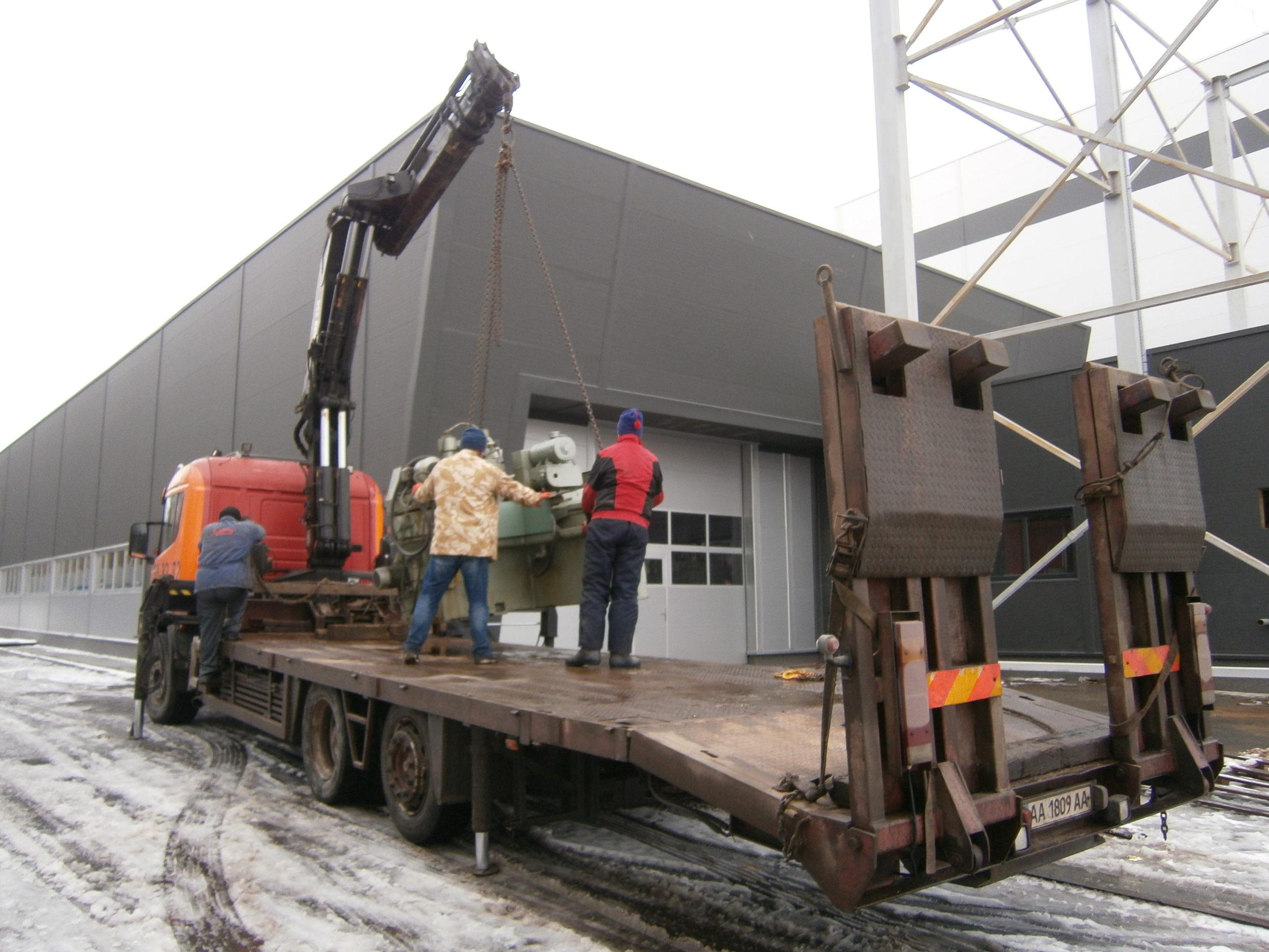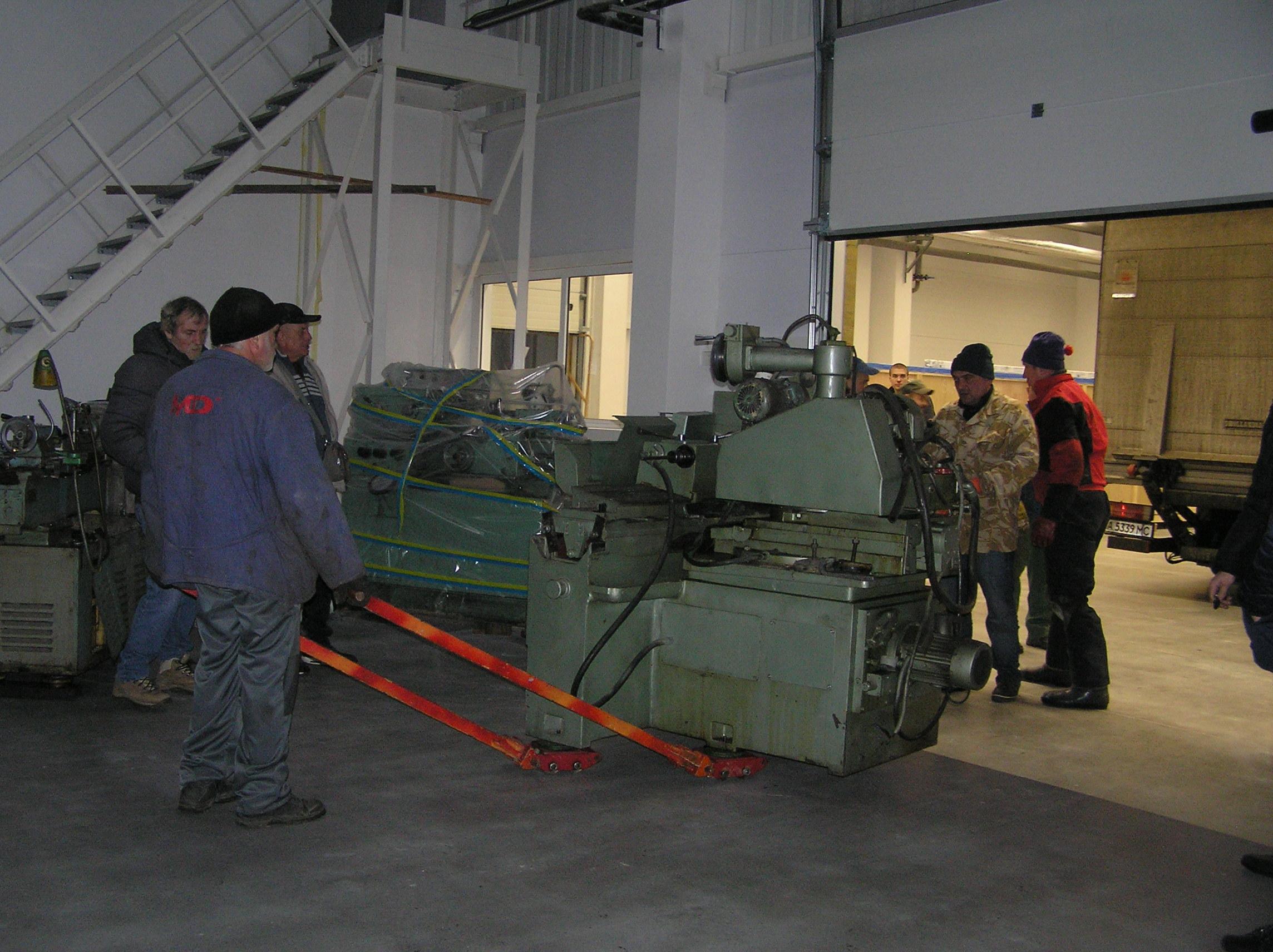 Шлифовальный станок весом около 4 тонн предстояло перевезти из одного производственного помещения в другое. Первым делом станок нужно было выкатить на улицу, чтобы его смог взять манипулятор. Станок домкратами был поднят и установлен на транспортные тележки. Затем он был обвязан и закреплен к лебедке. В несколько заходов, маневрируя по территории цеха, шлифовальный станок был перемещен наружу, в зону действия крана- манипулятора.