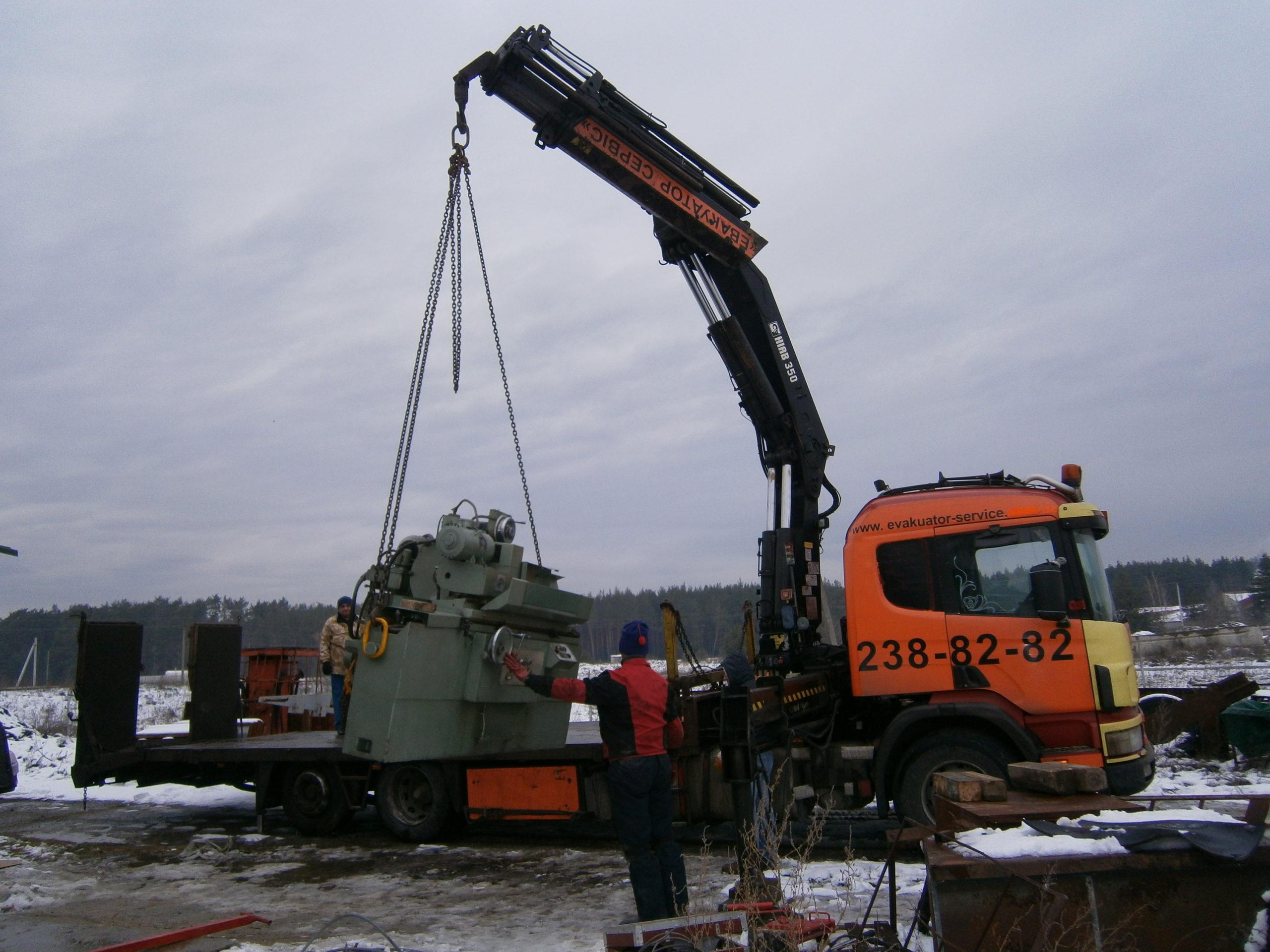 Манипулятором шлифовальный станок был установлен на платформу и надежно закреплен. После доставки на новое место станок так же бережно был разгружен и предварительно установлен на деревянные бруски.