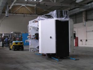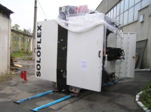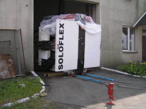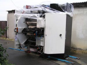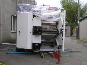 Станок является частью линии по перемотке пленки, поэтому должен был быть установлен строго параллельно своим соседям. Окончательная точная установка станка осуществлялась уже после снятия с катков, когда агрегат стоял на бетонном полу.