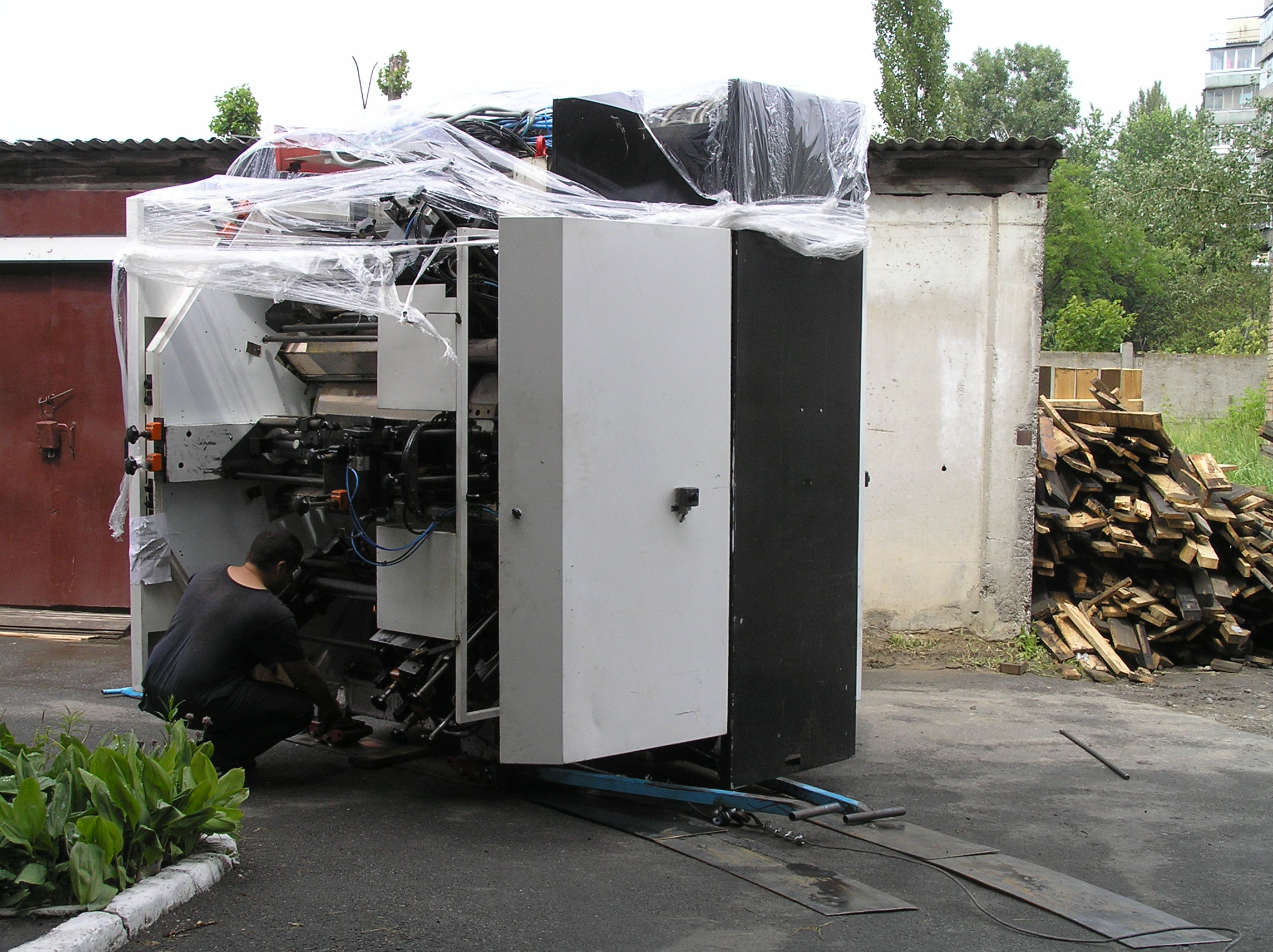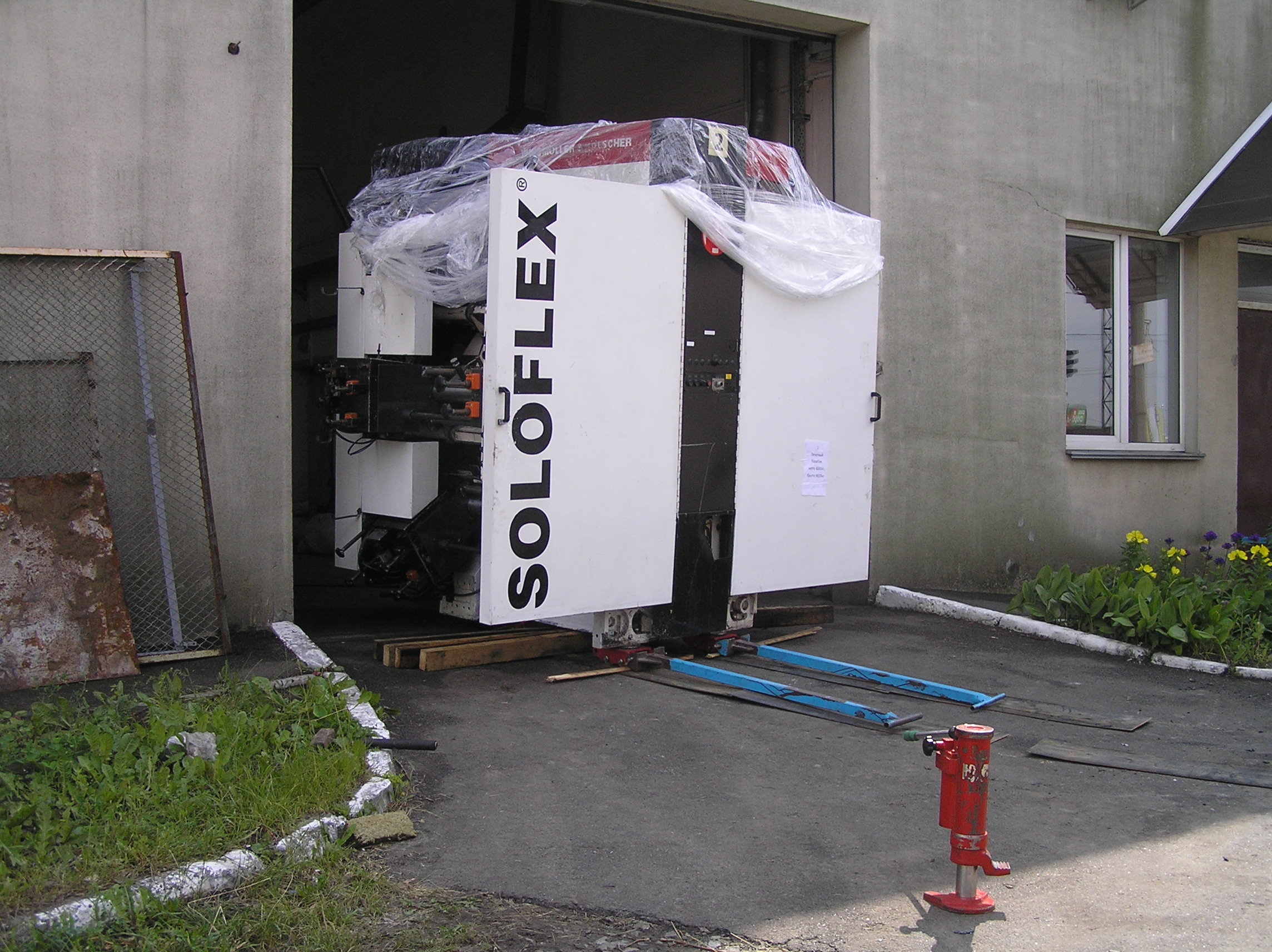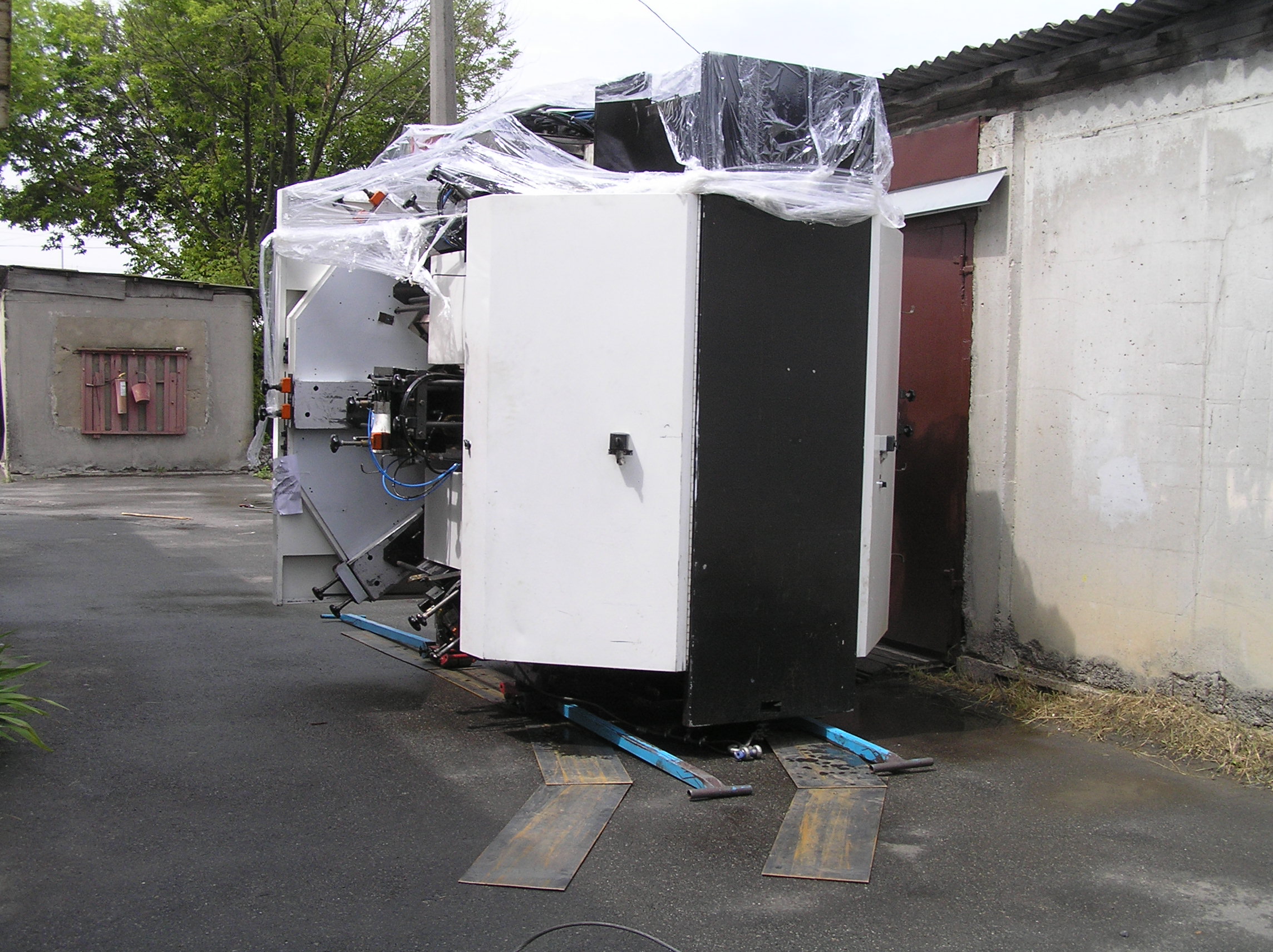 Настала наша очередь решать проблемы. Предстояло переместить станок 50 метров по мягкому асфальту, по нему же с подъемом и поворотом заехать в цех и уже по полированному бетону прокатиться в дальний угол к месту установки.